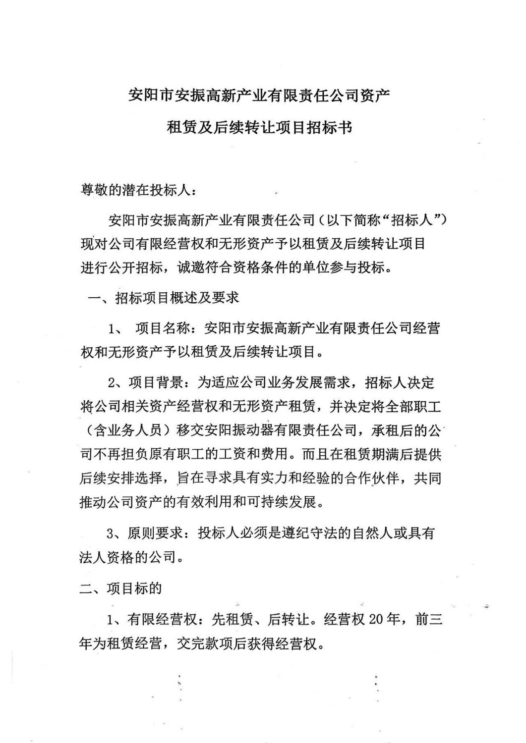 安陽市安振高新產(chǎn)業(yè)有限責任公司資產(chǎn)租賃及后續(xù)轉(zhuǎn)讓項目招標書